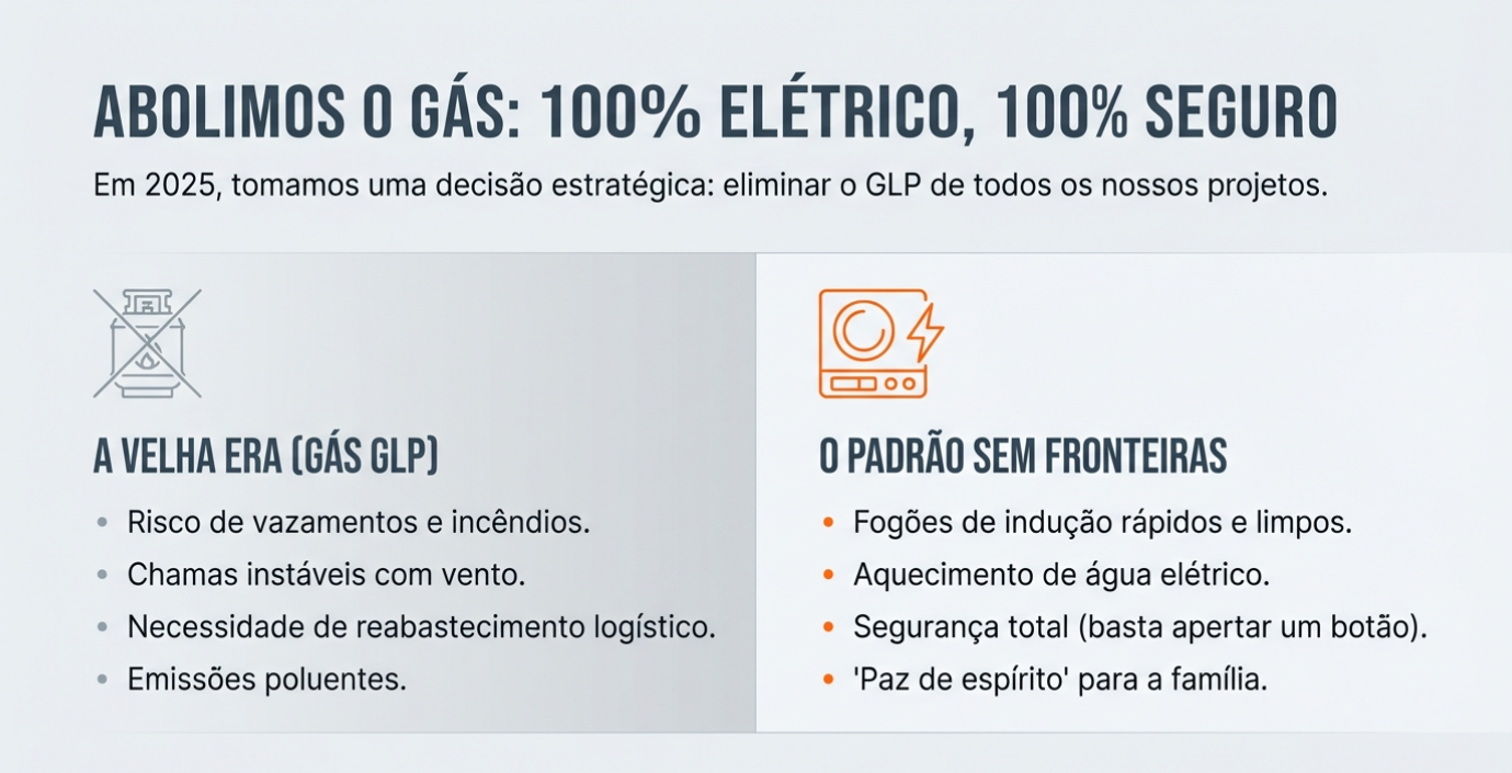 Uma das decisões mais impactantes e corajosas da Sem Fronteiras em 2025 foi abolir completamente o uso de gás de cozinha (GLP) em seus projetos. Para quem não está familiarizado, o tradicional botijão de gás era, por décadas, o coração da cozinha e do aquecimento em um motorhome.