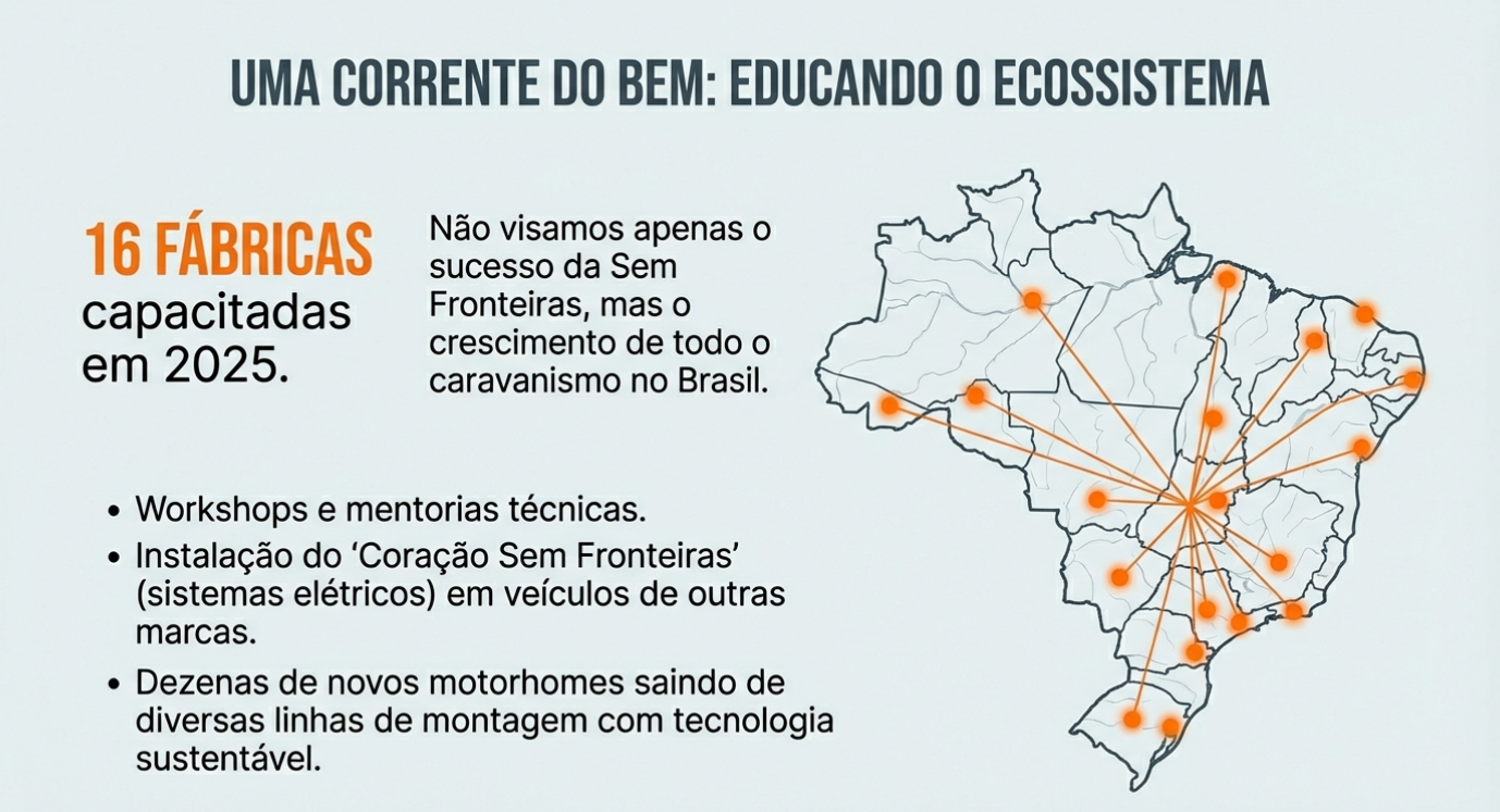 A empresa treinou 16 outras fábricas de motorhomes no Brasil, de gigantes do setor a pequenas oficinas, em seus avançados sistemas de energia. Em vez de guardar a tecnologia como um segredo industrial, eles abriram as portas, ensinaram suas equipes e ajudaram a implementar seus próprios padrões de qualidade e segurança em veículos de outras marcas.