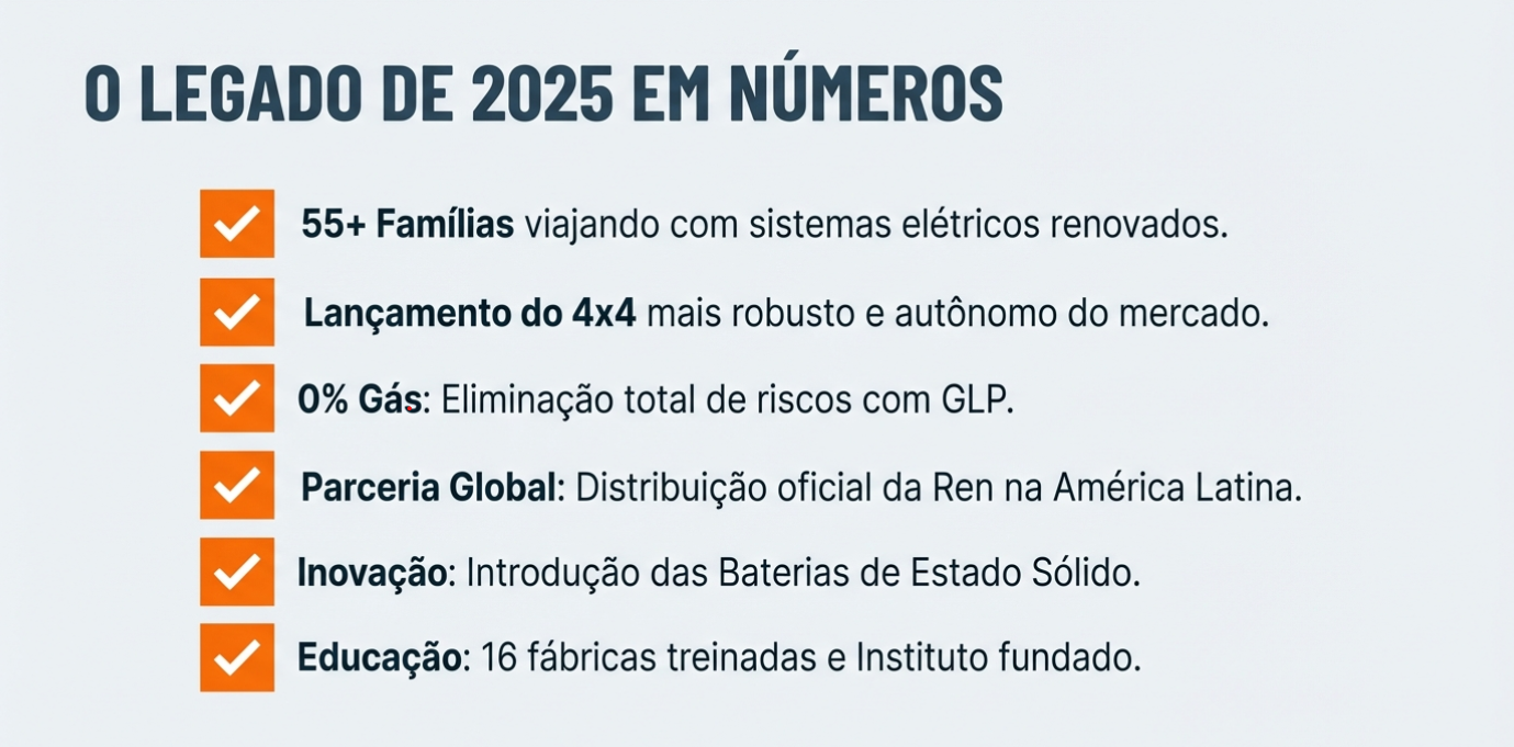 O ano de 2025 foi muito mais do que um período de conquistas para uma única empresa. Foi o ano em que o patamar do caravanismo no Brasil foi elevado. As inovações em segurança, a democratização da tecnologia de ponta, a criação de veículos sem limites e a colaboração entre concorrentes acenderam uma nova luz sobre a vida na estrada.