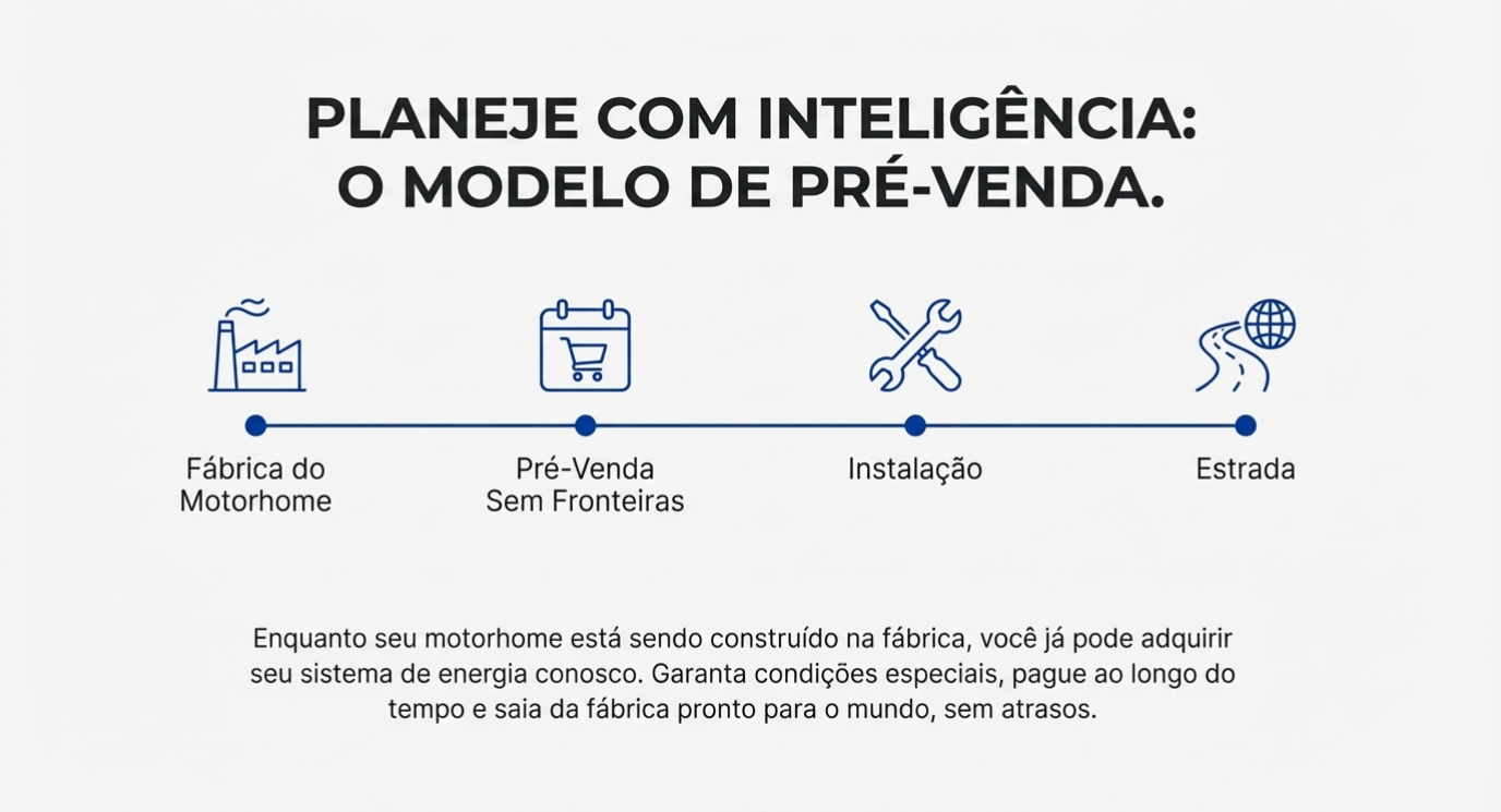 Um dos modelos de negócio mais fascinantes apresentados é o conceito de "pré-venda". Neste modelo, o cliente investe em uma solução complexa — um sistema elétrico completo — enquanto seu motorhome ainda está na linha de montagem de outra fábrica. Ele compra e paga por um componente vital de sua futura vida na estrada antes mesmo de ter usado o veículo.