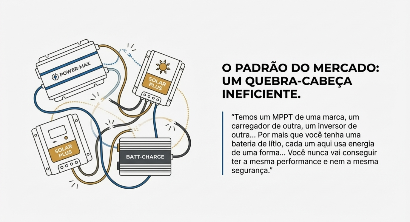 Um erro comum em projetos de alta tecnologia é acreditar que a combinação dos "melhores" componentes individuais resultará no melhor sistema possível. No mundo dos motorhomes, isso significa comprar um inversor de alta qualidade de uma marca, um controlador de carga solar (MPPT) de outra e um carregador de bateria de uma terceira.