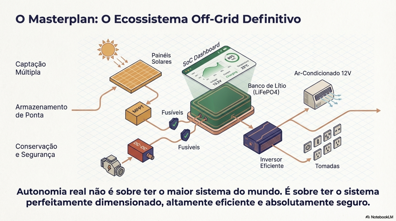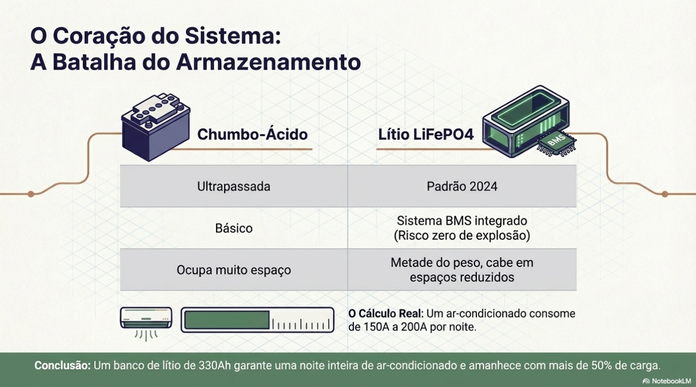Até pouco tempo, as baterias de chumbo-ácido eram o padrão, mas essa tecnologia é hoje considerada arcaica para as exigências do nomadismo moderno. Para sustentar itens de alto conforto, como ar-condicionado, Air Fryer e secadores de cabelo, a transição para as baterias de Lítio Ferro Fosfato (LiFePO4) é mandatória.