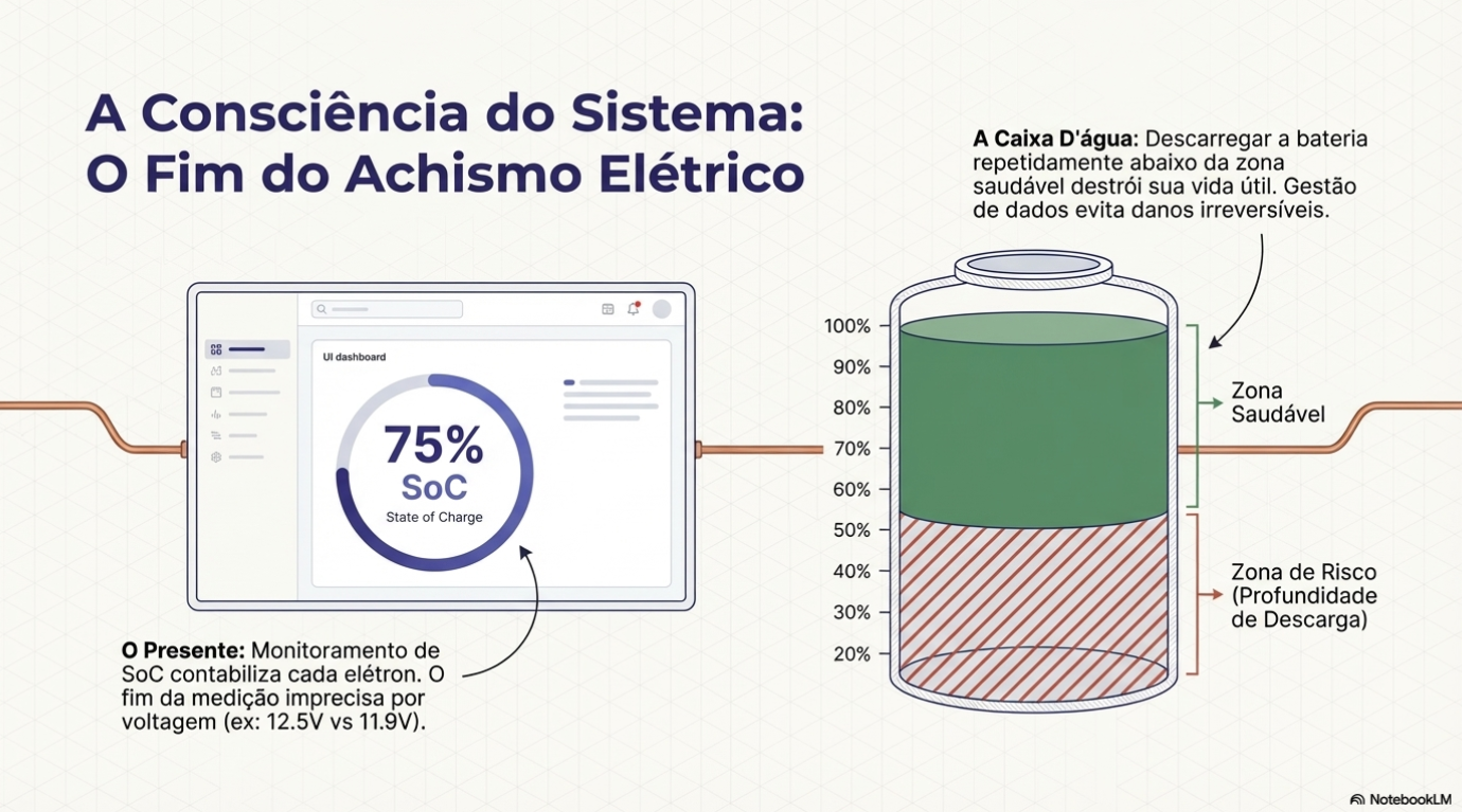 Imagine a bateria como uma caixa d'água. Se você não sabe o nível real, acaba usando o fundo da caixa, onde a sujeira e a pressão baixa prejudicam o sistema. Na engenharia off-grid, utilizamos o Business Intelligence (BI) para monitorar cada ampère. Através de sistemas baseados em nuvem, conseguimos rastrear o comportamento elétrico do veículo em tempo real. Essa gestão de dados permite que a fábrica acompanhe a saúde do seu sistema à distância, garantindo que suas baterias durem anos e justificando garantias estendidas de até 5 anos.