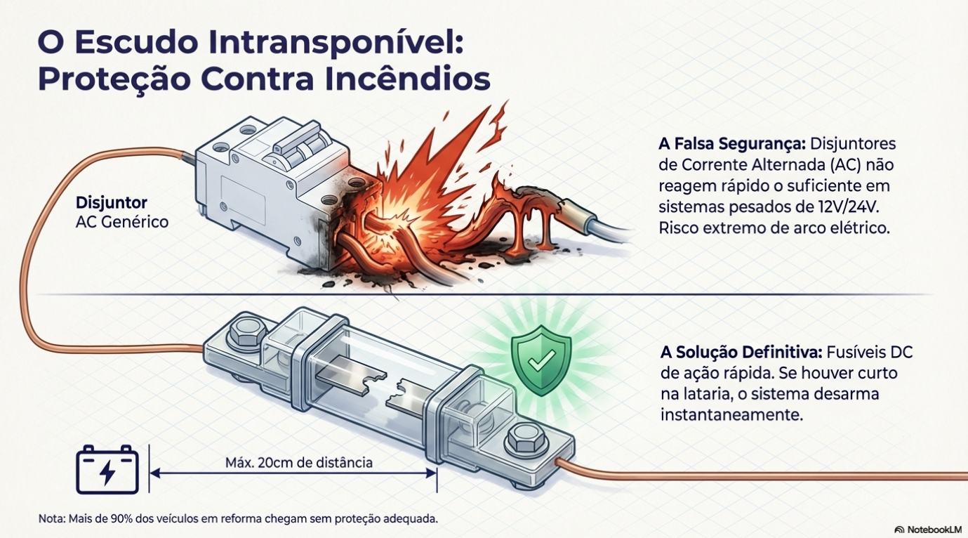 A proteção elétrica é onde 90% dos motorhomes no Brasil falham, colocando em risco o patrimônio e a vida dos viajantes. Há um erro perigoso em utilizar disjuntores residenciais (projetados para Corrente Alternada - AC) em sistemas de Corrente Contínua (DC). Em altas correntes, esses dispositivos falham em extinguir arcos elétricos, o que pode levar a incêndios catastróficos.