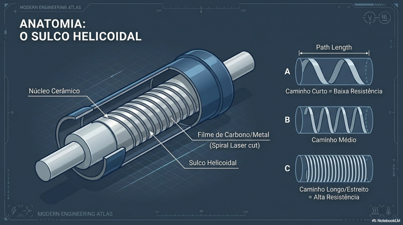 Para ajustar o valor, um laser ou torno mecânico corta uma espiral (hélice) nesse material condutor, forçando os elétrons a percorrerem um caminho muito mais longo e estreito. A geometria define o destino: