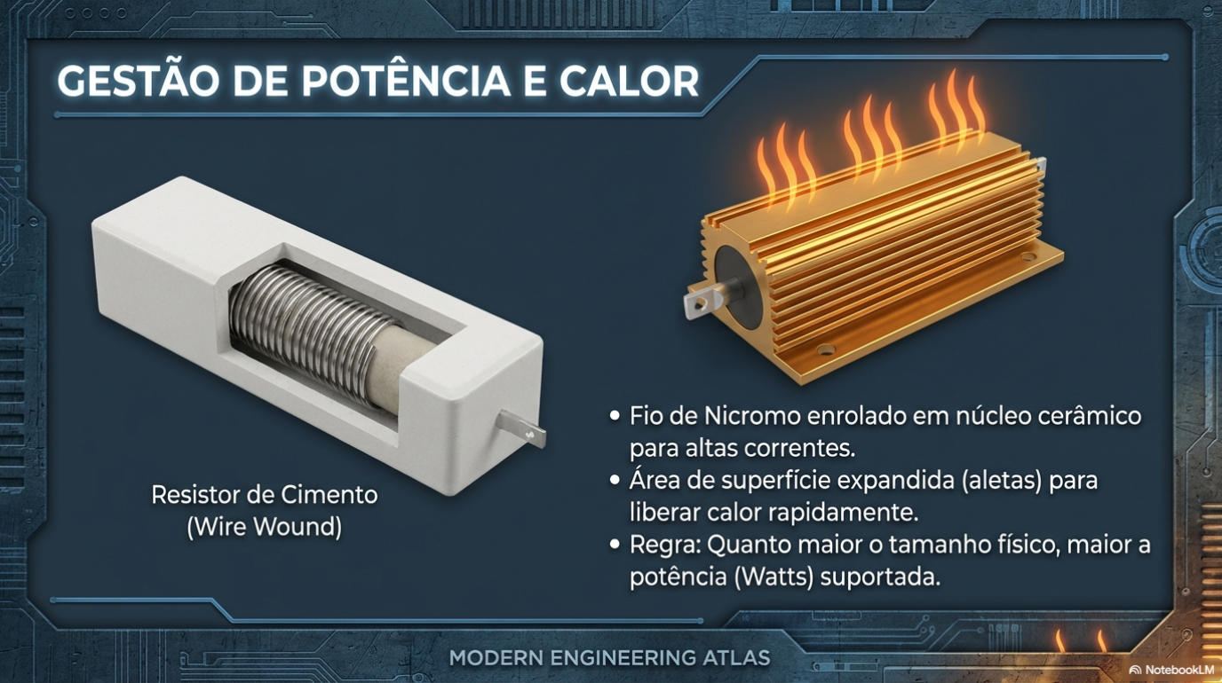 Na eletrônica, o tamanho físico não diz nada sobre a resistência (Ohms), mas diz tudo sobre a potência (Watts). Como o resistor é um conversor de eletricidade em calor, ele precisa de área de superfície para dissipar essa energia.