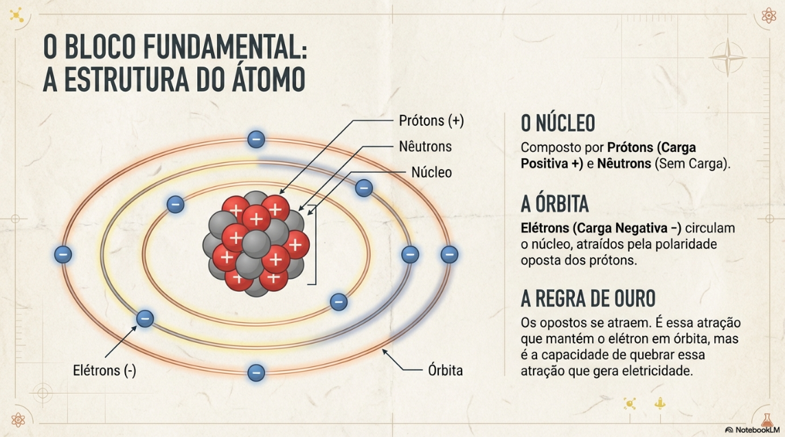 Para entender a eletricidade, precisamos voltar ao básico, à partícula que compõe tudo ao nosso redor: o átomo. Cada átomo possui um núcleo com prótons (de carga positiva) e nêutrons (sem carga). Orbitando esse núcleo, como planetas ao redor do sol, estão os elétrons, que possuem carga negativa. Os opostos se atraem, então a carga positiva dos prótons mantém os elétrons negativos em órbita.