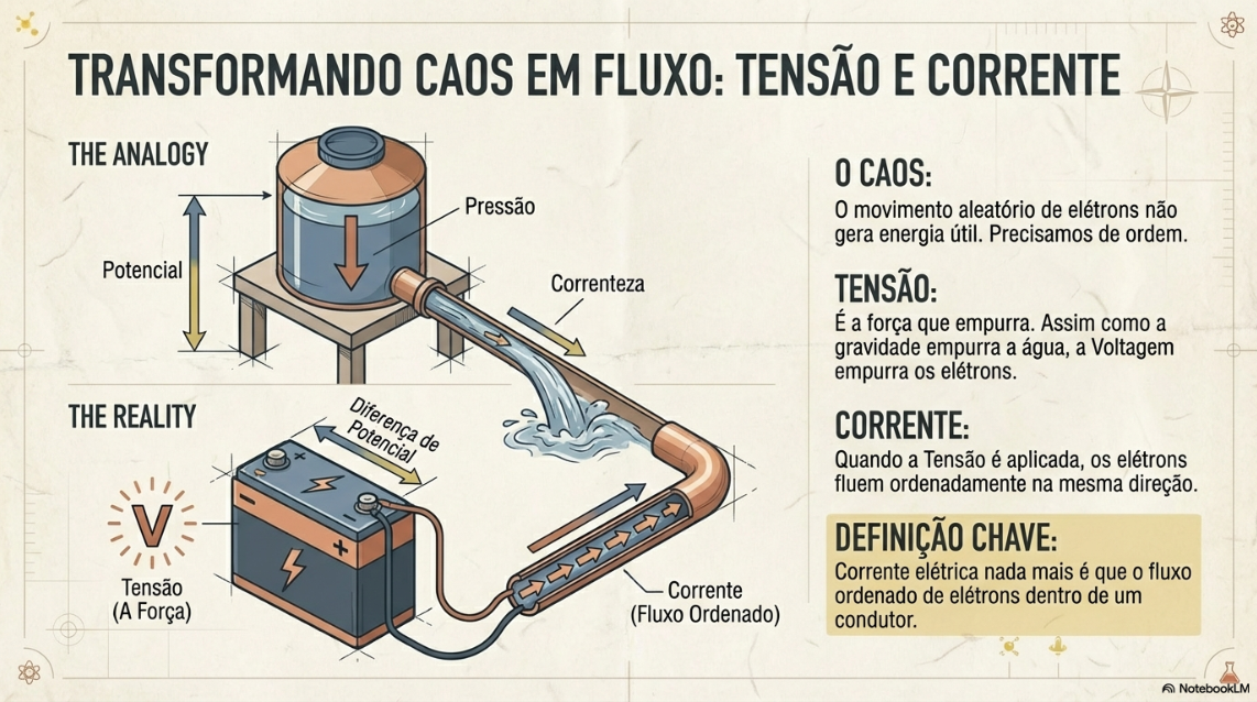 A melhor analogia para entender isso é a de um rio. Assim como a água flui em uma correnteza de um ponto a outro, os elétrons fluem em um fio. E o que faz a água do rio se mover? Uma força, geralmente a gravidade, que age sobre a diferença de altura. Na eletricidade, a lógica é a mesma: a força que "empurra" os elétrons é chamada de tensão, e ela é gerada por uma diferença de potencial, como a que existe entre os polos de uma bateria. Assim como a diferença de altura move a água, a diferença de potencial move os elétrons, organizando seu movimento aleatório em um fluxo único e poderoso.