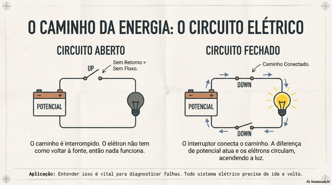 Para que os elétrons fluam e realizem um trabalho (como acender uma lâmpada), eles precisam de um caminho completo. Esse caminho, que sai de uma fonte de energia, passa por um dispositivo e retorna à fonte, é chamado de circuito elétrico.