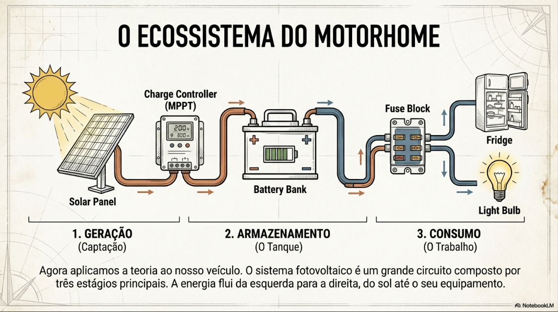Ao final desta leitura, você não verá mais o sistema elétrico do seu motorhome como um emaranhado confuso de fios, mas sim como um fluxo de energia lógico e compreensível, que você pode entender e gerenciar com confiança.