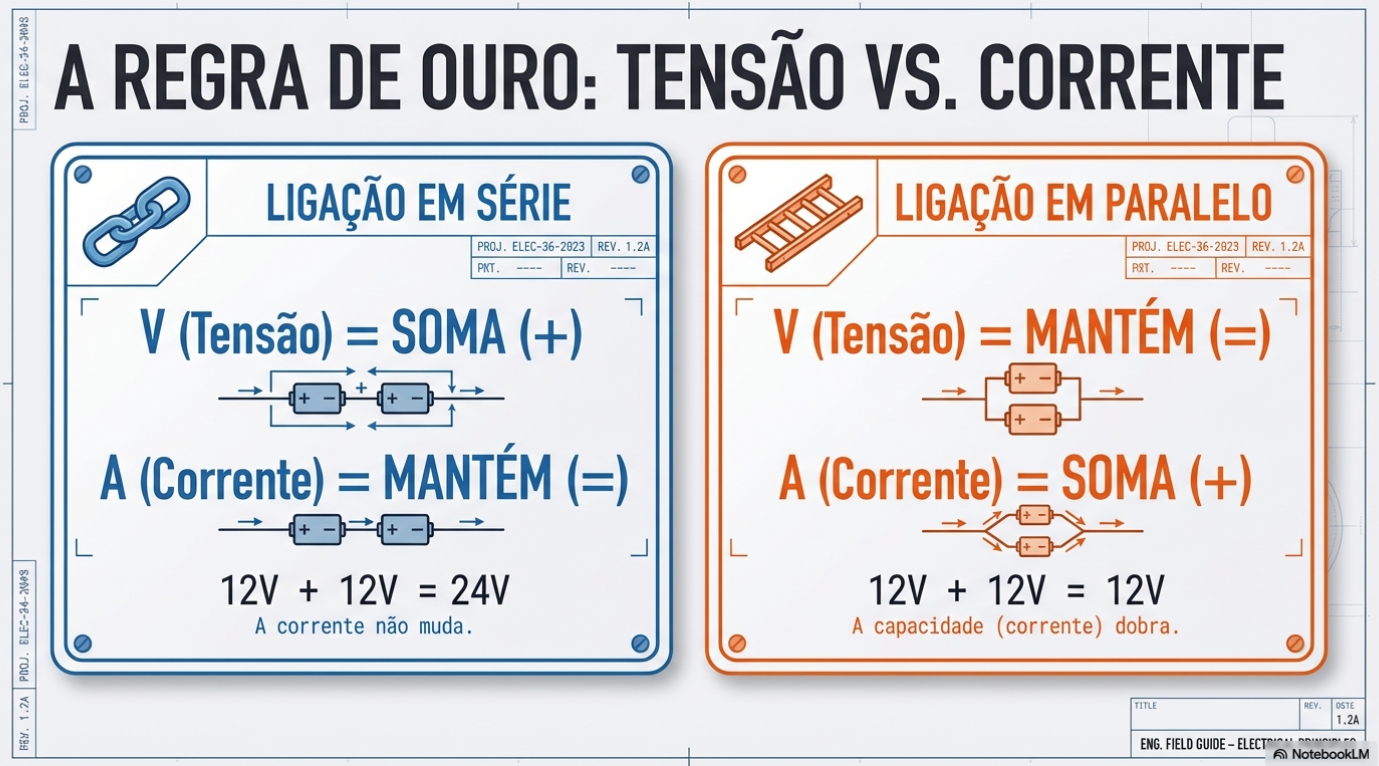 Ao optar pela ligação em série, você mantém a corrente baixa, o que permite o uso de cabos muito mais finos e leves. É a mesma lógica das concessionárias de energia que transportam eletricidade em alta tensão por quilômetros para evitar desperdícios e cabos absurdamente grossos.