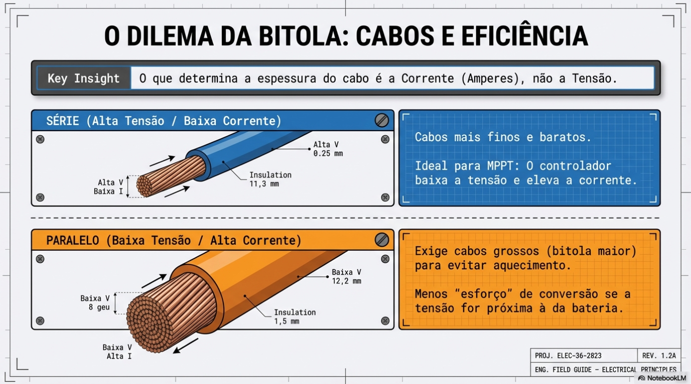 Um erro comum é ignorar o custo e o peso da fiação. A regra de ouro na elétrica aplicada é: quanto maior a Corrente (Amperagem), maior deve ser a bitola (espessura) do cabo.