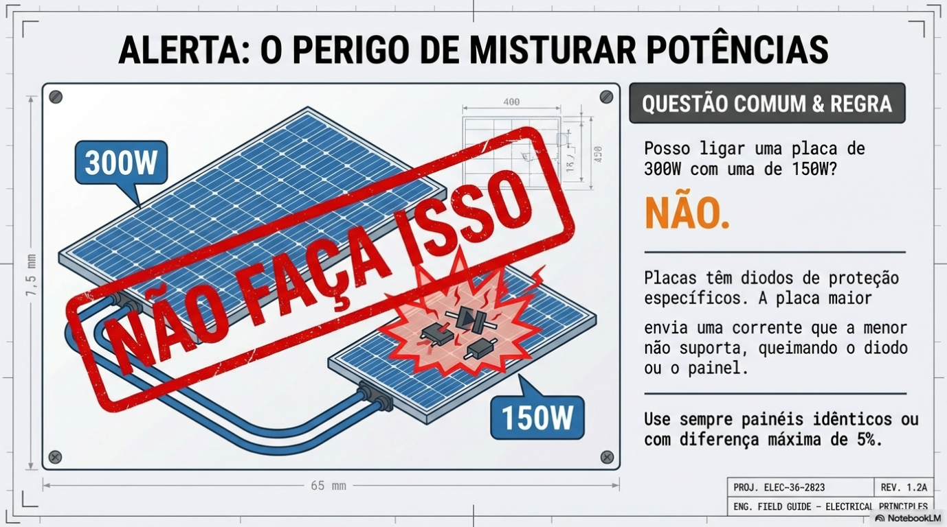 O Exceção Técnica: Existe um cenário onde a mistura é possível. Se você tiver uma placa de 300W, poderia teoricamente ligá-la em paralelo com duas placas de 150W conectadas em série (visto que 150V+150V resultaria em uma potência combinada equivalente). Contudo, a diferença de potência não deve ultrapassar 5% para evitar desequilíbrios de resistência interna. Minha recomendação final é clara: mantenha placas e baterias idênticas para evitar falhas catastróficas.