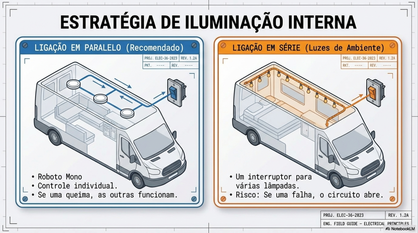 • Iluminação em Paralelo: É o padrão ouro para motorhomes. Cada lâmpada LED é ligada independentemente, permitindo interruptores individuais. Se uma lâmpada falha, você não fica no escuro total.