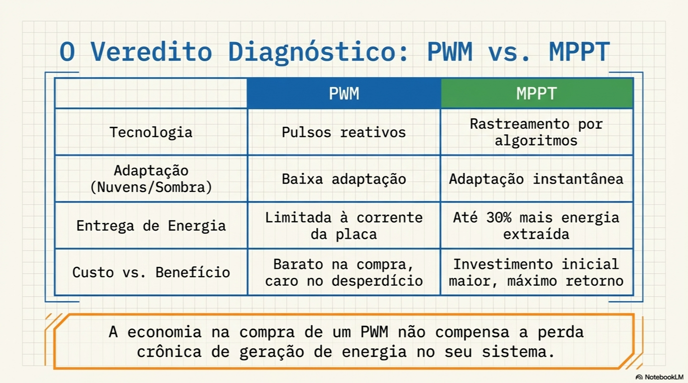 A escolha entre as tecnologias PWM (Pulse Width Modulation) e MPPT (Maximum Power Point Tracking) é a decisão de engenharia mais crítica do seu projeto. O PWM é uma solução rudimentar. Ele funciona através de pulsos, igualando a voltagem da placa à da bateria de forma bruta.