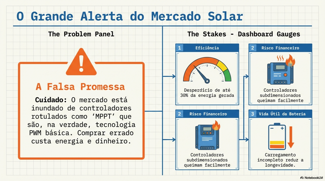 O ceticismo é sua melhor ferramenta de defesa. Um MPPT real pode entregar até 30% mais energia ao longo de um ciclo de carregamento. Economizar R$ 200,00 na compra de um controlador genérico pode custar milhares de reais em baterias subcarregadas e na necessidade de instalar mais painéis para compensar a ineficiência.