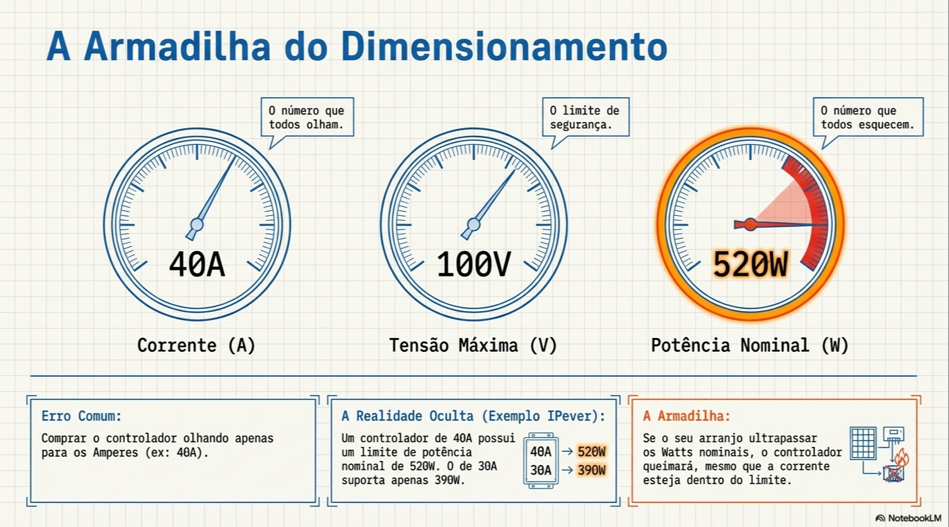 Um dos erros mais graves que encontro em projetos DIY é o foco exclusivo na corrente (Amperes), ignorando o datasheet técnico. Muitos acreditam que um controlador de 40A é suficiente para qualquer arranjo que não ultrapasse esse valor de corrente. No entanto, existe um limite de potência nominal em Watts e um limite de tensão (Volts) que são implacáveis.