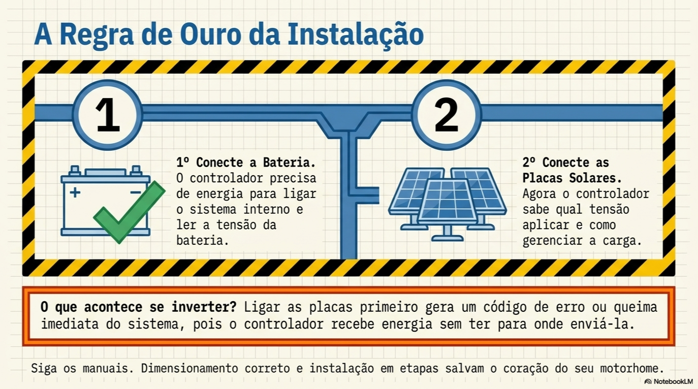 A sequência de conexão não é uma sugestão, é uma regra de segurança. Conecte sempre a bateria primeiro, e só depois os painéis solares. O motivo técnico é crucial: o controlador precisa realizar a detecção automática da tensão do sistema (12V ou 24V).