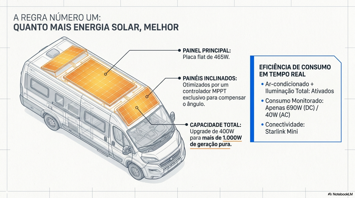 Maximizar a geração solar em áreas limitadas é um desafio de engenharia que separa amadores de especialistas. Em nossos projetos de reforma, frequentemente elevamos a potência de modestos 400W para mais de 1000W, "sobrecarregando" o teto com inteligência. Utilizamos placas de alta performance (como as de 465W) e, quando o espaço plano se esgota, recorremos a painéis inclinados. O segredo aqui é a gestão: cada conjunto inclinado recebe um controlador de carga específico para garantir que a angulação não prejudique a eficiência do sistema total. Essa abundância energética permite trocas luxuosas, como substituir o antigo "climatizador" evaporativo por um ar-condicionado real e eficiente. Somamos a isso a adoção da Starlink Mini, que entrega internet global com um consumo drasticamente reduzido. No caravanismo moderno, a regra é clara: quanto mais solar, melhor. É a fonte de liberdade mais barata e sustentável que existe.