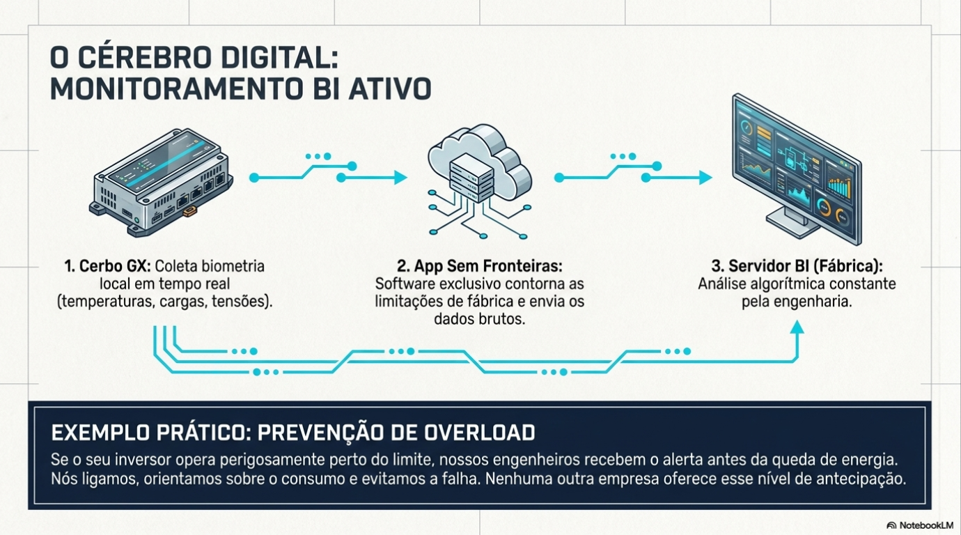 A verdadeira segurança é silenciosa e proativa. Enquanto o mercado utiliza o monitoramento padrão, nós utilizamos o Cerbo GX como hospedeiro para um aplicativo exclusivo desenvolvido pela Sem Fronteiras. Esse software envia dados em tempo real para o nosso próprio servidor de Business Intelligence (BI). Isso significa que nossos especialistas na fábrica podem identificar, por exemplo, se o seu inversor está operando próximo ao limite de sobrecarga (overload) de forma recorrente. Antes mesmo de você perceber uma falha, nós entramos em contato para orientar o uso e evitar interrupções. É o monitoramento ativo garantindo que sua única preocupação seja a paisagem pela janela.