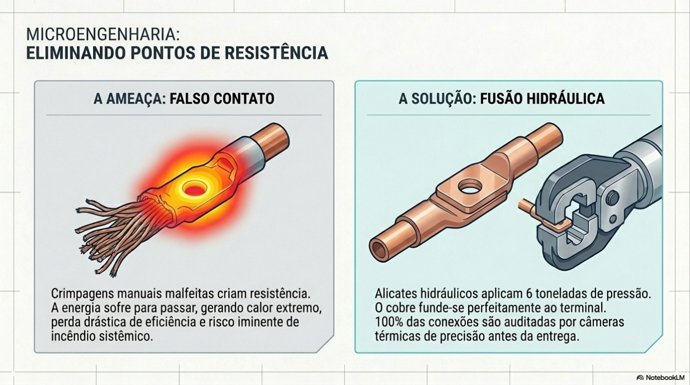 Detalhes invisíveis aos olhos, mas visíveis ao calor, definem a longevidade de um sistema. Durante nossos testes de carga, utilizamos câmeras térmicas para escanear cada conexão em busca de hotspots (pontos de aquecimento). Um ponto quente é sinônimo de resistência, perda de energia e risco de incêndio. Para eliminar esse problema, utilizamos ferramentas de precisão que aplicam até 6 toneladas de pressão na crimpagem dos terminais. Esse processo promove uma "solda a frio", onde o cobre do cabo e o do terminal se fundem virtualmente em um único corpo condutor. Complementando esse cuidado estrutural, todo o sistema elétrico é montado sobre uma base de alumínio com um "gap" (espaço) estratégico, protegendo os componentes sensíveis contra qualquer eventual infiltração de água no compartimento de carga.