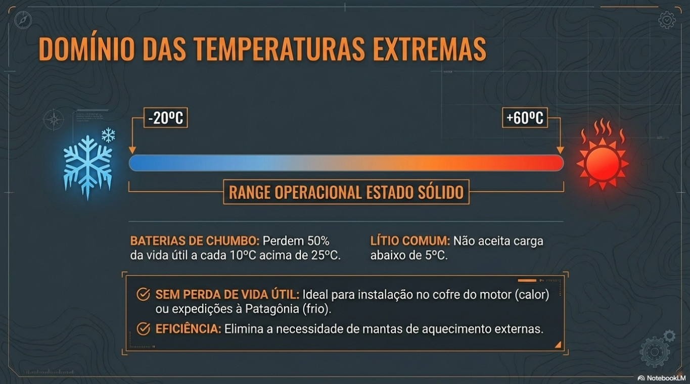 Quem já enfrentou o frio de Ushuaia ou os ventos da Patagônia sabe que as baterias comuns param de carregar abaixo de 5°C. As baterias de estado sólido, no entanto, operam em um range fenomenal de -20°C a 60°C. Graças ao sistema de aquecimento interno, elas utilizam a própria energia para manter as células na temperatura ideal, garantindo performance total mesmo em climas glaciais.