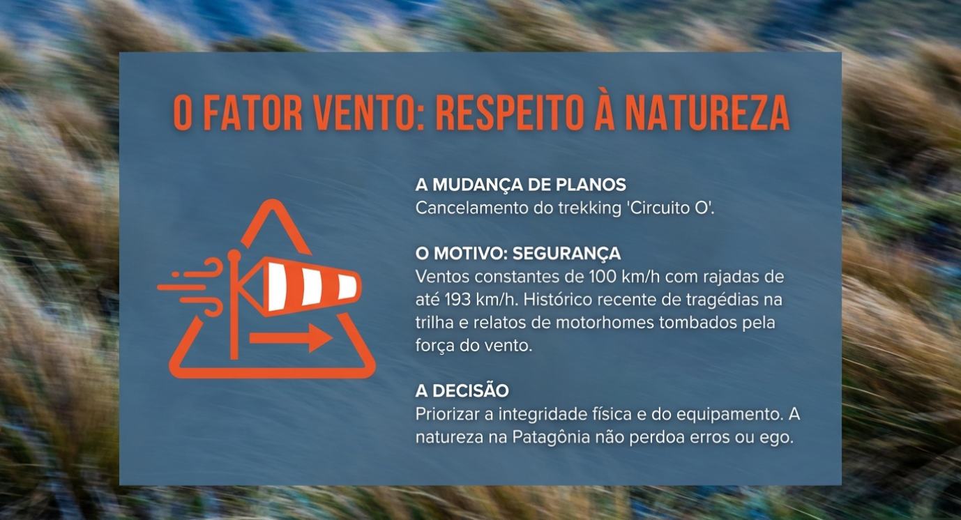 Um dos momentos mais difíceis da viagem foi a decisão de cancelar a tão sonhada trilha, o circuito "O" em Torres del Paine. A decisão, embora dolorosa, foi um ato de prudência. A natureza patagônica havia mostrado sua força de maneira trágica: um acidente grave na mesma trilha resultou na morte de cinco pessoas, causado por ventos que atingiram impressionantes 193 km/h. Na mesma semana, um motorhome foi tombado pela fúria do vento na região.