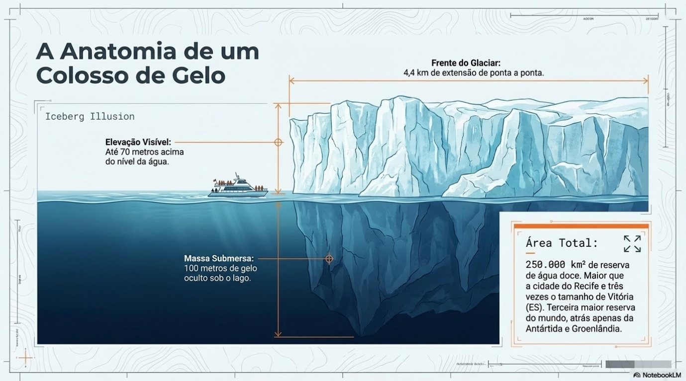 A escala real, porém, só é processada pelo cérebro humano através do contraste. Ao observar um catamarã de turismo navegando próximo à parede de gelo, o barco — que carrega dezenas de pessoas — parece uma minúscula peça de brinquedo prestes a ser engolida. O glaciar cobre uma área de aproximadamente 250 km², uma extensão maior que a cidade de Recife e três vezes o tamanho de Vitória (ES).