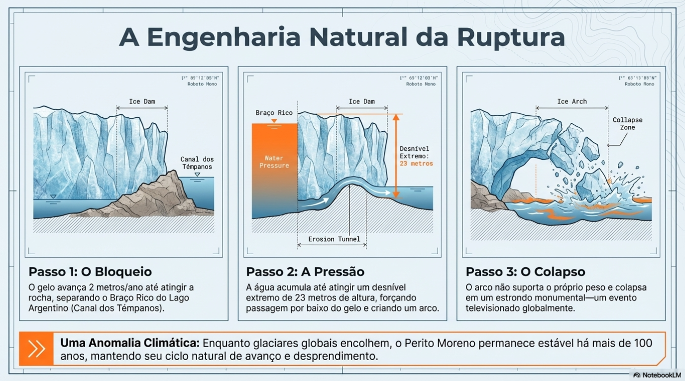 O fenômeno geológico mais impressionante ocorre quando o glaciar avança até tocar a Península de Magallanes, isolando o Braço Rico. A água represada sobe de nível de forma dramática — já foram registradas diferenças de até 23 metros de altura entre os lados. Essa pressão absurda começa a erodir o gelo por baixo, criando o famoso "arco" ou ponte natural. Quando essa estrutura finalmente colapsa, o rugido é ouvido a quilômetros de distância.