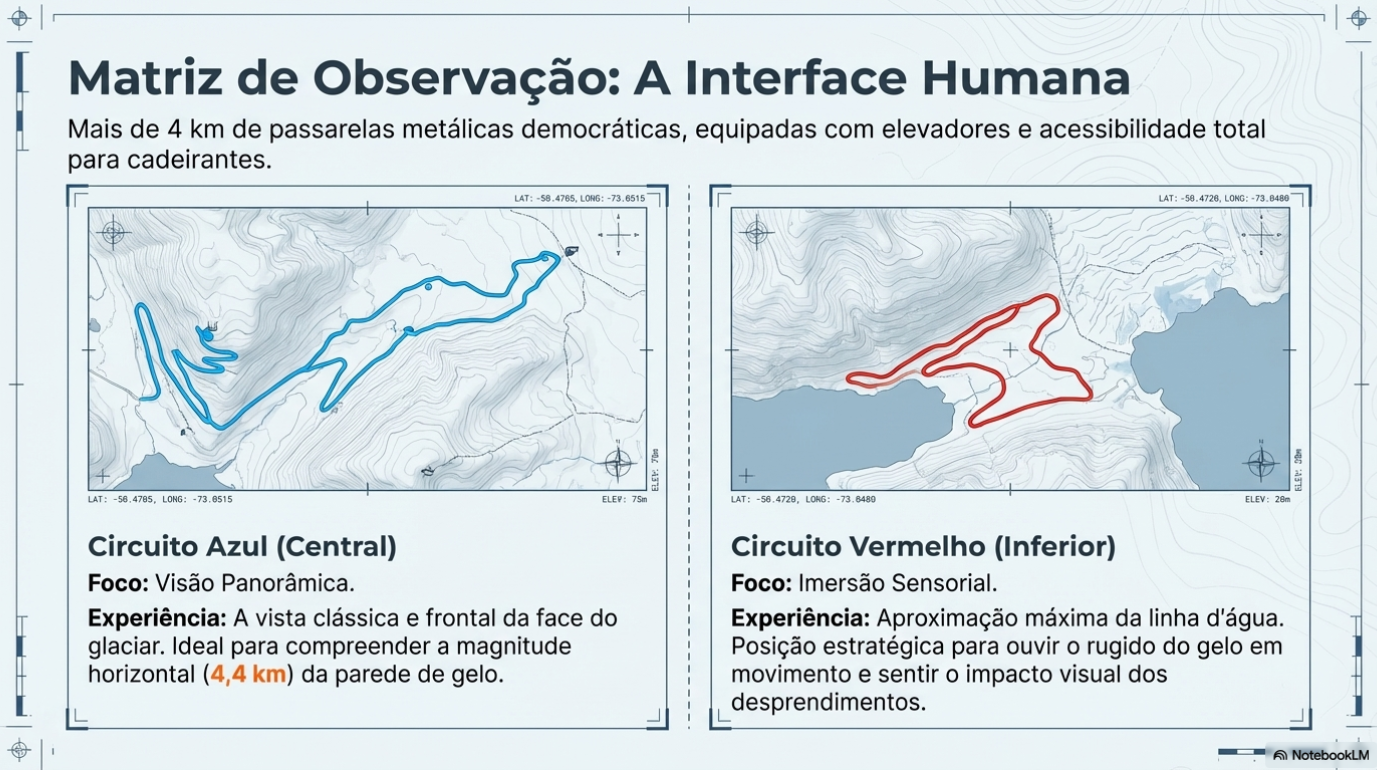 A infraestrutura do parque é um exemplo de como tornar o remoto acessível. São mais de 4 km de passarelas metálicas interconectadas por elevadores e rampas, permitindo que até pessoas com mobilidade reduzida sintam o sopro gelado do glaciar.