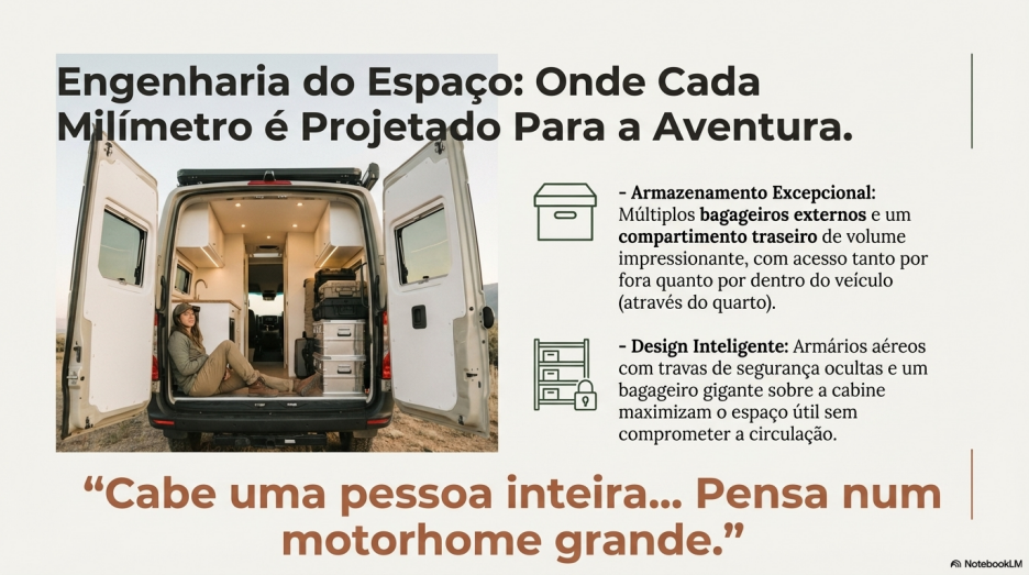 A primeira coisa que choca neste motorhome de apenas 6 metros de comprimento por 3,30 de altura é a quantidade de espaço para guardar coisas. O bagageiro externo é tão vasto que uma pessoa adulta consegue entrar e ficar confortavelmente lá dentro, uma capacidade raramente vista em veículos dessa categoria. Internamente, a otimização continua com múltiplos armários aéreos, um grande baú sob o sofá e um bagageiro gigantesco acima da cabine. A surpresa se torna ainda maior quando os apresentadores, que admitem não serem "nada minimalistas" e carregarem um "kit alegria", concluem que o espaço seria mais que suficiente. A incredulidade era palpável, com Renan verbalizando o que todos pensavam: