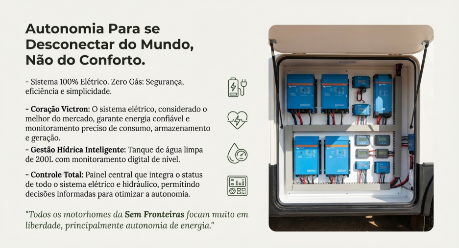 Alinhado com uma tendência moderna de autossuficiência, este motorhome abandonou completamente o uso de gás. O projeto é 100% elétrico, contando com um fogão de indução e um forno multifuncional que opera como micro-ondas, air fryer, forno convencional e grill. Essa decisão vai além da modernidade: ela aumenta a segurança, eliminando os riscos associados ao gás, simplifica a manutenção ao unificar o sistema de energia e se alinha perfeitamente com um estilo de viagem mais sustentável. Para alimentar tudo isso, o veículo foi equipado com um robusto sistema elétrico da Victron, tornando a necessidade de conectar o motorhome a uma tomada externa um evento raro. Esse foco na independência é a materialização do lema da Sem Fronteiras: "viva a liberdade".