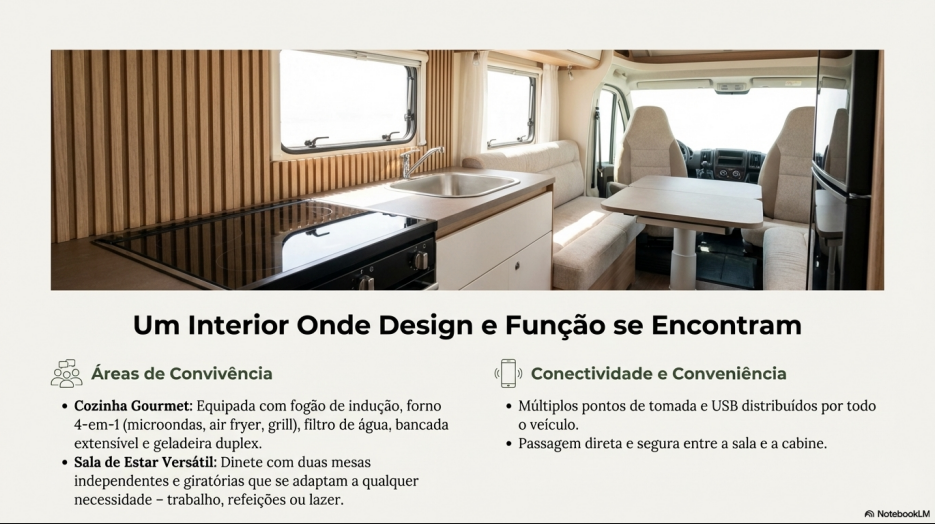 Além dos grandes destaques, o motorhome está repleto de soluções de engenharia que otimizam o dia a dia. A área de refeições, por exemplo, não é apenas uma mesa, mas um hub versátil que se transforma de sala de jantar em um escritório remoto em segundos, graças às suas duas mesas independentes e giratórias. Na cozinha, uma bancada extensível desliza de dentro do móvel, oferecendo a chave para preparar refeições ambiciosas sem se sentir apertado. Detalhes práticos, como a escada de acesso externa elétrica e retrátil e a passagem direta entre a cabine e a casa, completam um projeto onde cada centímetro foi pensado para a máxima conveniência.