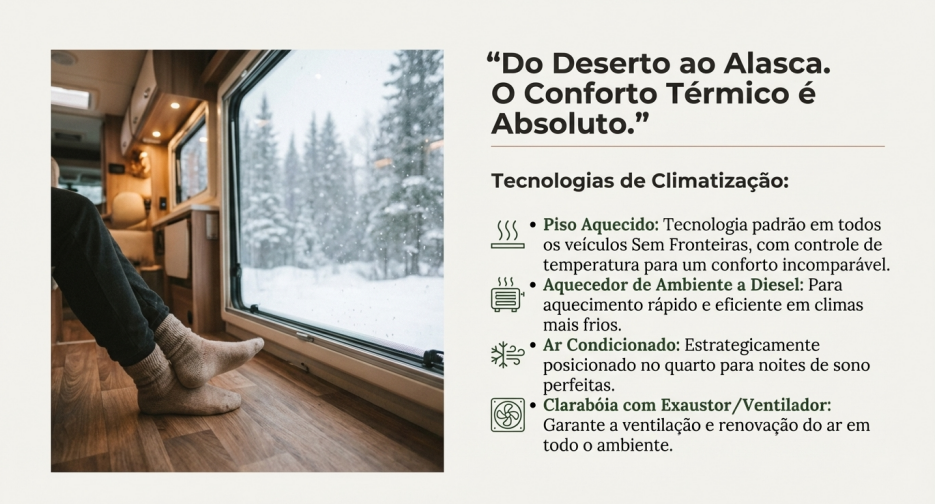 A base Iveco 4x4 já garante a robustez para enfrentar qualquer terreno, mas o verdadeiro diferencial deste projeto é combinar essa capacidade com um conforto térmico preparado para qualquer extremo climático. O motorhome foi projetado para ser uma fortaleza de conforto, seja para explorar praias escaldantes ou montanhas nevadas. Ele conta com ar condicionado no quarto, um aquecedor de ambiente a diesel e, o mais impressionante, piso aquecido em toda a casa. Essa combinação de robustez externa com um ambiente interno perfeitamente climatizado permite que os aventureiros sonhem com destinos como Ushuaia ou Alasca, sabendo que o conforto estará garantido. É a promessa de liberdade total, para qualquer lugar, em qualquer estação do ano.
