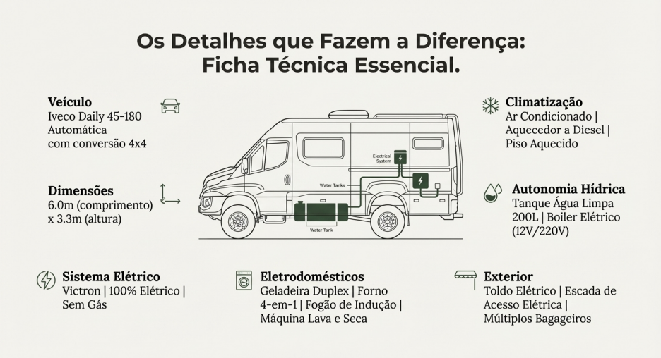 Este Iveco 4x4 da Sem Fronteiras prova que, com engenharia inteligente e um projeto focado na experiência do usuário, é possível superar as limitações tradicionais de um motorhome. Ele resolve os dilemas clássicos dos viajantes: o armazenamento abundante acaba com a angústia de fazer as malas, a autonomia energética oferece liberdade para acampar em locais remotos, o banheiro residencial elimina um dos maiores compromissos da vida na estrada, os detalhes inteligentes tornam a rotina mais fluida e o conforto térmico abre o mapa para qualquer aventura. Ele não é apenas uma casa sobre rodas, mas um novo padrão de como viver sem fronteiras.