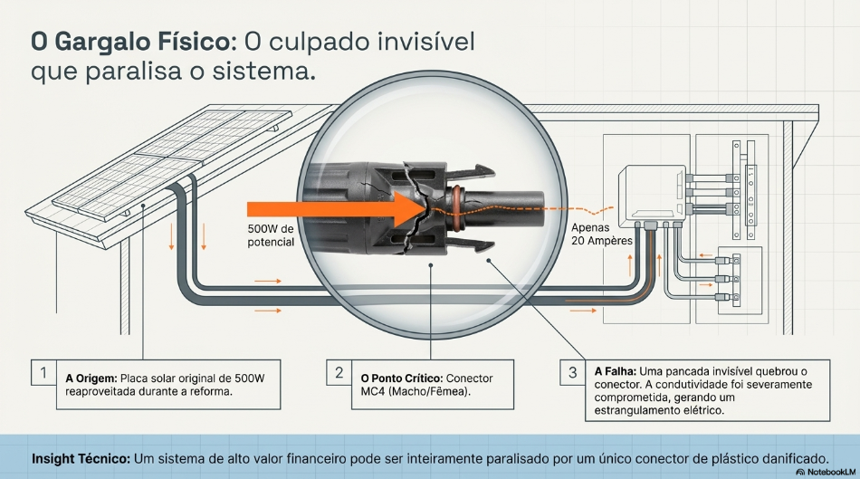 Déficit de Geração: Queda de um potencial de 500W para uma colheita real de <20A/dia (devido ao conector defeituoso).