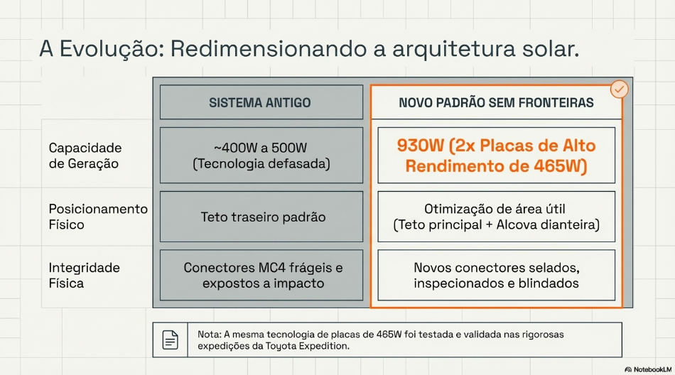Com essa configuração, o motorhome atinge um novo nível de eficiência térmica e energética. A meta é que o veículo produza o dobro do seu consumo nominal. Isso permite que, mesmo com equipamentos pesados em funcionamento sob sol pleno, o sistema ainda disponha de uma sobra de 30A a 40A para carregar as baterias simultaneamente.